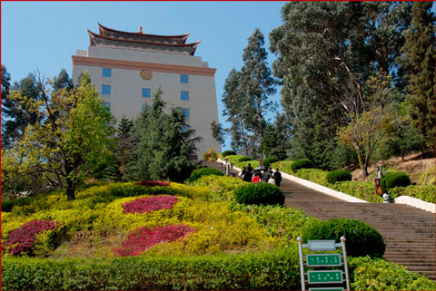 其地:得西山之蒼翠,擁滇池之浩渺,與天地感應,聚山水靈氣而得之。其勢:插地而起,真入云霄,登上金寶塔極目遠眺,盡攬五百里滇池,帆影鷗翔,美不勝收。
