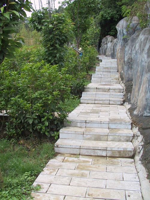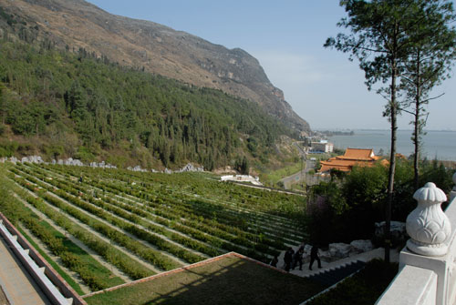 福壽園蜿蜒的石階,適宜緩慢步行登高,西山剛性的碧綠滋潤眼簾,精致的小灌木叢長滿山坡,每一片葉子,都彰顯著地氣的靈秀。石階旁爬滿了藤蔓,向著陽光,盡情的舒展著。這一剛一柔的組合,恰似天成,遙遙呼應(yīng)著著碧水藍天的滇池。