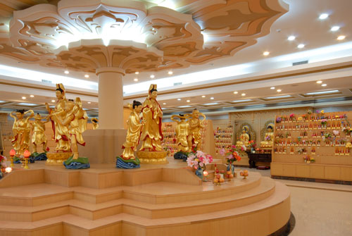 金寶塔二樓的蓮位大廳寬敞明亮,是專門(mén)設(shè)置的蓮位供奉場(chǎng)所。大廳居中的連頂立柱上端,是分三層迭次向上開(kāi)放的一朵巨大蓮花!洞笳亍方(jīng)說(shuō):“蓮花有四德,一香、二凈、三柔軟、四可愛(ài)”。在這里,蓮花象征凈土世界,往生西方極樂(lè)世界,會(huì)有觀音手持蓮花迎接。蓮位大廳分為內(nèi)外兩層,內(nèi)層正中,是四尊觀音菩薩立像面向四方,八位善財(cái)童子和龍女分別護(hù)侍;外層三面,均是莊嚴(yán)肅穆的西方三圣坐像,諸佛菩薩在一片金碧輝煌中,迎接著來(lái)到西方極樂(lè)世界的眾生。