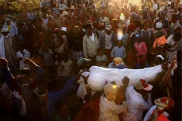 翻尸換衣儀式是馬達(dá)加斯加一個較新的傳統(tǒng)。在那里,人們?nèi)匀幌嘈潘篮箪`魂沒有完全離開身體,直至它腐爛,而這一過程可能需要數(shù)年。儀式的目的是用新的壽衣重新包裹尸體。這部分做完后,這個家庭就圍著換裝尸體的墓前跳舞,就好像這一天是她的生日。這一做法已在最近幾年比較少見,一部分原因是做壽衣的絲綢成本上升,另一部分原因是在于福音派基督教,他們對同已逝親屬的骸骨跳舞比較反感。