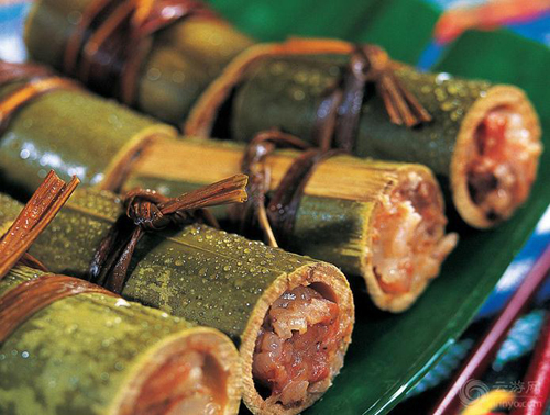 傣族喜歡飲用“竹筒茶”,傣族語“臘跺”,這是一種充滿詩情畫意的飲茶方式,先用曬干的春茶放入剛砍回的香竹筒內(nèi),放在火塘的三腳架上烘烤,6—7分鐘后,竹筒內(nèi)茶葉軟化,用木樟將竹筒內(nèi)茶葉舂壓后再裝進茶葉,這樣邊裝、邊烤、邊舂,直至竹筒內(nèi)茶葉填滿舂緊為止,待茶烤干后,削開竹筒取出圓柱型的茶葉,掰少許茶葉放人碗中,沖人沸水約五分鐘即可飲用。這種竹筒茶,既有竹子的青香,又有茶葉的芳香,非?煽。
