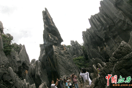 雖然在電視和圖片上看到過石林的風(fēng)貌,但林林總總的怪石成片一下子出現(xiàn)在眼前時,記者還是被這些突兀崢嶸、千姿百態(tài)的石林奇觀給震住了。