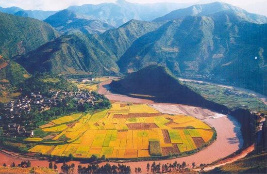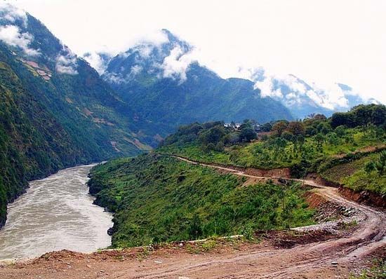 千里怒江從西藏境內一路而下,流經丙中洛鄉(xiāng)日丹村附近時,由于絕壁阻隔,江流猛然向西突轉,流出三百多米后,又被丹拉大山的陡坡?lián)踝,江流再次轉向南方。江水咆哮,氣勢磅礴。江流的大回環(huán),在峽谷里形成了一個很大的半圓形大灣。灣上的臺地高出江面約五百米,平坦開闊,三面環(huán)水,風光綺麗。往北4公里,就是貢山最北端的丙中洛鄉(xiāng)。出境就是西藏自治區(qū)的察隅地區(qū)。怒江、瀾滄江、金沙江咆哮而下,貢山是“三江并流”的最狹窄點。自西向東二江(獨龍江、怒江)三山(擔當力卡山、高黎貢山、碧羅雪山)縱貫全境。