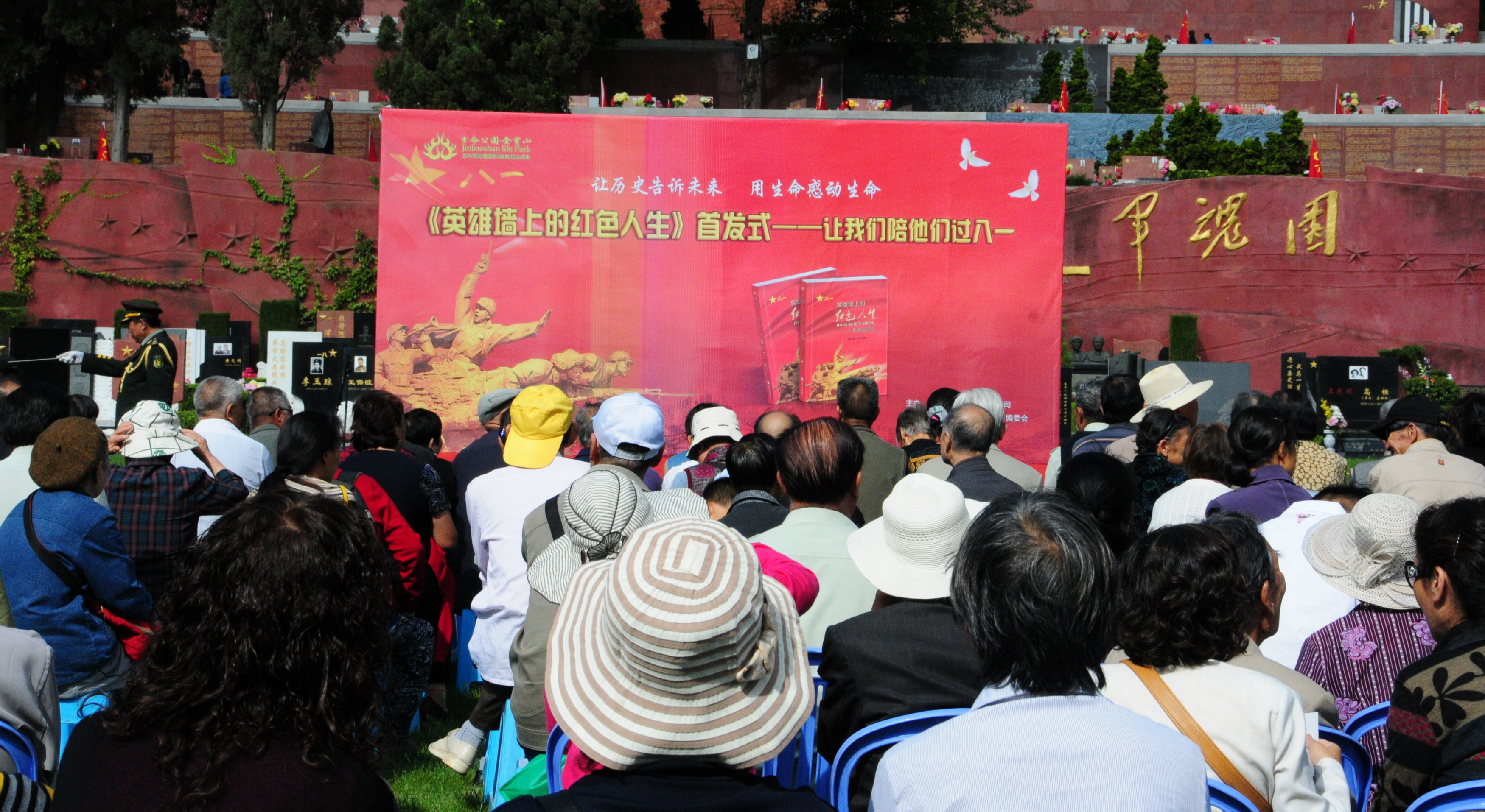 儀式現(xiàn)場 ,《英雄墻上的紅色人生》書籍編委會成員、離退休老軍人、軍人家屬,以及金寶山員工和聞訊專程趕來的民眾400多人在軍魂園肅然站立。在《英雄墻上的紅色人生》陳列桌前,人們迫不及待地翻閱,或回首或感嘆或沉思.......