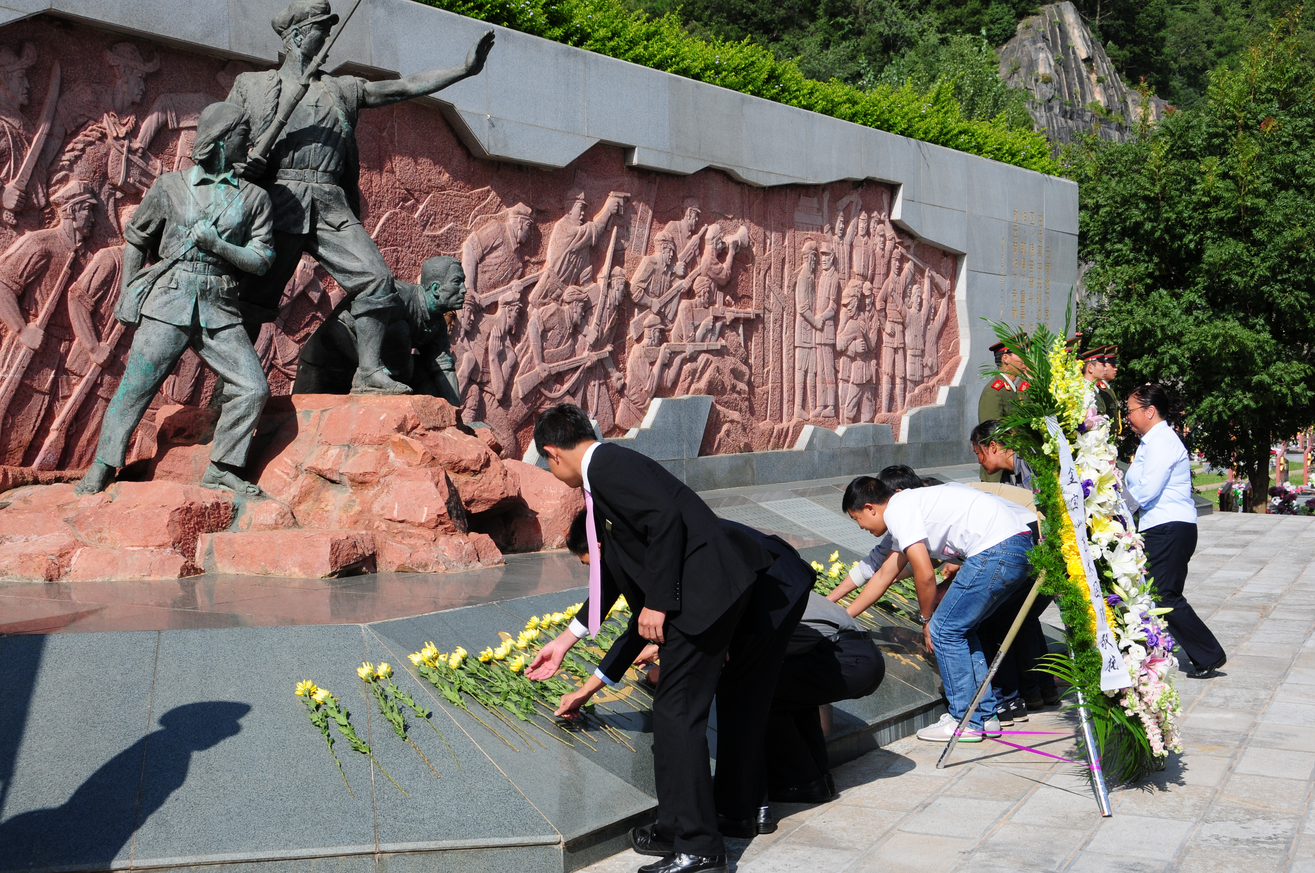上午10:00,金寶山主管、經(jīng)理近60人整齊列隊(duì),在金寶山禮儀隊(duì)的帶領(lǐng)下,先后向邊縱英烈廣場、軍魂園、忠誠衛(wèi)士英烈廣場敬獻(xiàn)了花圈和鮮花。大家面向烈士肅立、鞠躬,默默地獻(xiàn)上一支支黃菊花,表達(dá)了對烈士的深深敬仰與緬懷,并瞻仰了烈士事跡。邊縱英烈廣場鐫刻著為解放云南犧牲的邊縱英烈的名字;忠誠衛(wèi)士英烈廣場安息著維和英雄李欽、鐘薦勤、和志虹和抗震英雄謝樵,英烈墻上刻錄著為云南邊防事業(yè)犧牲的69個(gè)烈士的簡介;軍魂園及墓園區(qū)也安息著諸多烈士。金寶山總經(jīng)理田軍表示:在第一個(gè)烈士紀(jì)念日來臨之日,我們應(yīng)當(dāng)弘揚(yáng)烈士精神、緬懷烈士功績,維護(hù)好園區(qū)的烈士紀(jì)念地,為社會提供開放的紀(jì)念平臺,讓社會各界通過舉辦烈士紀(jì)念活動,增強(qiáng)中華民族的凝聚力,激發(fā)實(shí)現(xiàn)中華民族偉大復(fù)興的精神力量。
