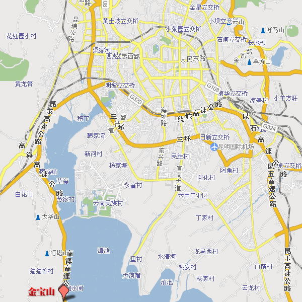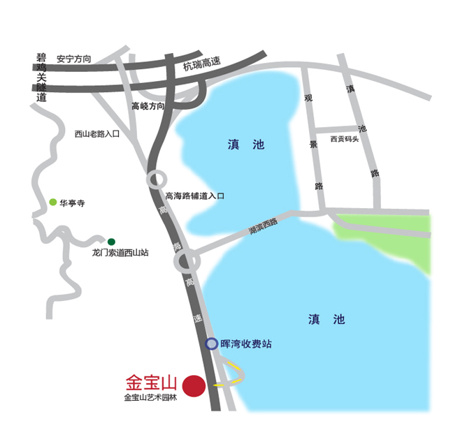 2、市區(qū)從南過境干線(或馬街)至碧雞關(guān)轉(zhuǎn)?诜较;安寧從昆安高速至碧雞關(guān)轉(zhuǎn)?诜较颍匆韵戮路行駛:經(jīng)高海公路主道過收費站(交費),直行至金寶山大門進(jìn)入;或經(jīng)高海公路輔道過收費站(不交費),左轉(zhuǎn)高架橋進(jìn)入金寶山。