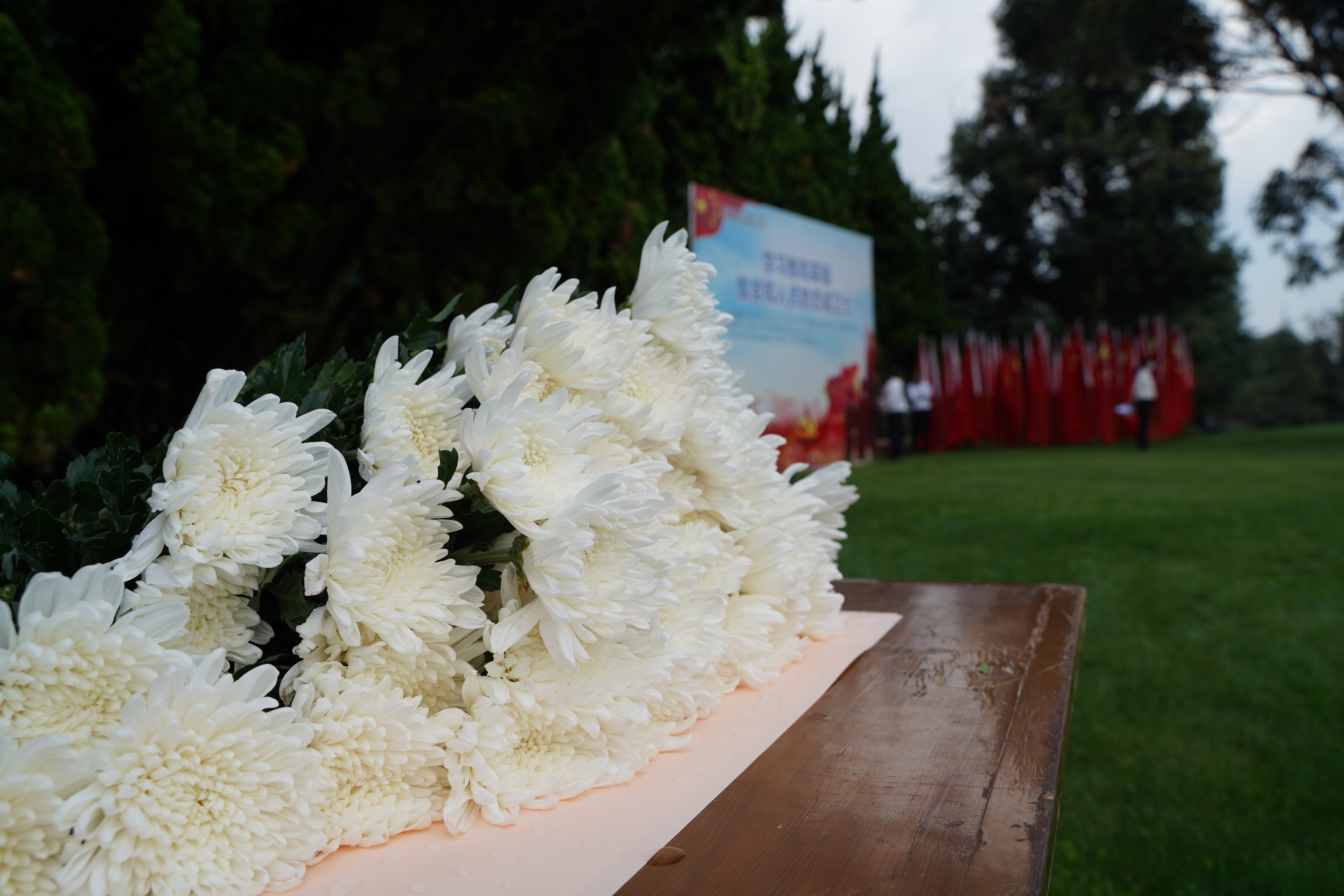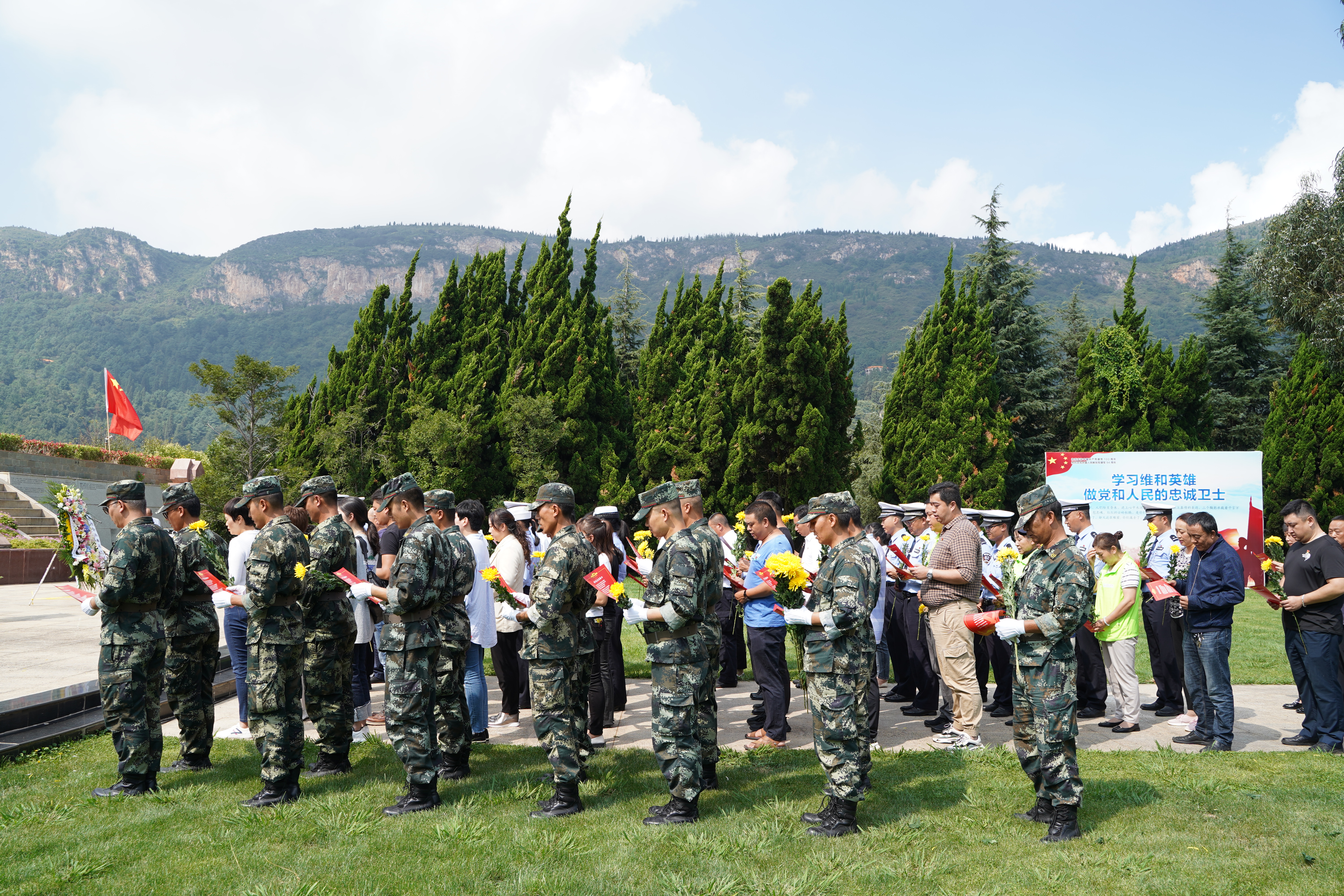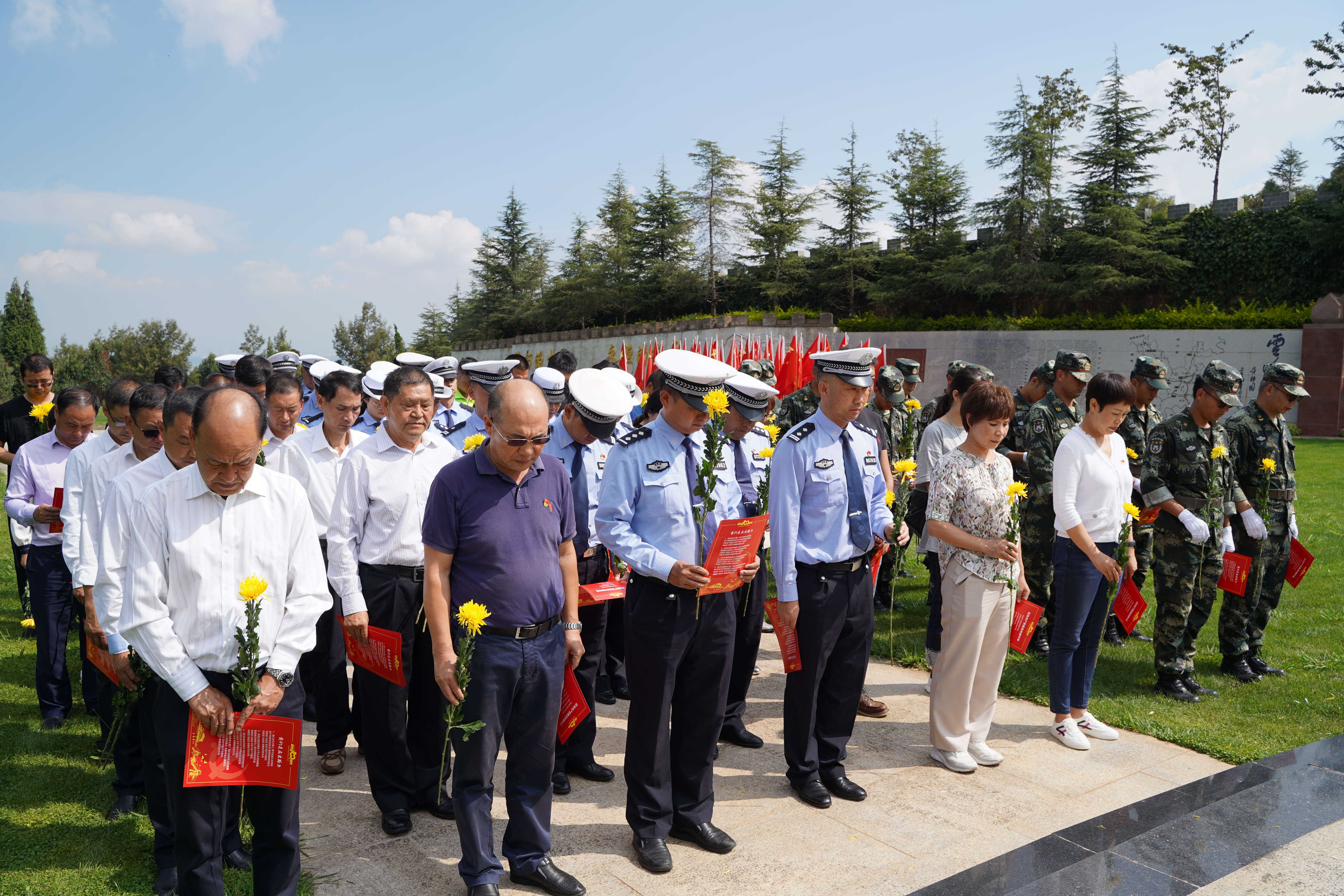 9月30日上午,全體人員在忠誠(chéng)衛(wèi)士英烈廣場(chǎng)共唱了一首高亢激昂的《義勇軍進(jìn)行曲》,拉開(kāi)了紀(jì)念活動(dòng)的帷幕。隨后,由昆明市交警四大隊(duì)八中隊(duì)黨員領(lǐng)誓,在場(chǎng)黨員重溫了入黨誓詞。歷經(jīng)100年的錘煉,中國(guó)共產(chǎn)黨帶領(lǐng)著中國(guó)人民求解放,富起來(lái),我們要時(shí)刻不忘黨的歷史,堅(jiān)決擁護(hù)黨的領(lǐng)導(dǎo)。在莊嚴(yán)的金寶山禮儀隊(duì)為烈士紀(jì)念碑獻(xiàn)上花籃后,大家將手中的清菊分別獻(xiàn)給了維和英烈們,緝毒英烈和抗震英烈。當(dāng)鮮花代表著和平,當(dāng)我們的天空不再有槍聲回蕩,當(dāng)我們的家園不再經(jīng)受炮火的洗禮,我們更應(yīng)該珍惜今天的美好生活來(lái)之不易,緬懷那些為著堅(jiān)定的共產(chǎn)主義信念而犧牲的革命先輩們。