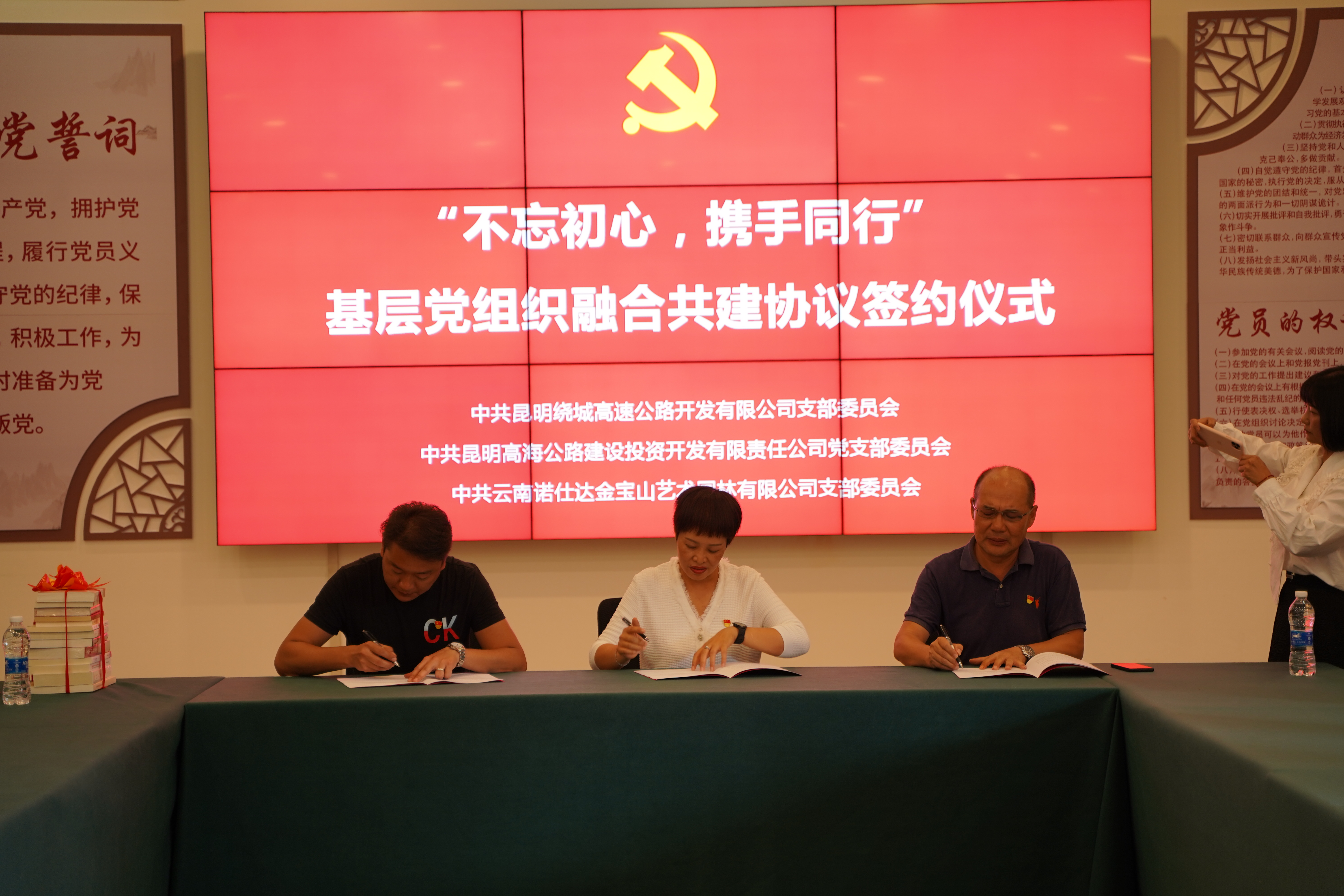 紀(jì)念活動(dòng)結(jié)束后,中共昆明繞城高速公路開(kāi)發(fā)有限公司支部、中共昆明高海公路建設(shè)投資開(kāi)發(fā)有限責(zé)任公司支部及中共金寶山黨支部,在金寶山黨群活動(dòng)中心簽訂了“不忘初心,攜手前行”基層黨組織融合共建協(xié)議。